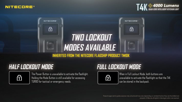 8. Διαθέτει δύο μεθόδους κλειδώματος που έχουν προέλθει από την ναυαρχίδα της NITECORE TM10K Λειτουργία ημι-κλειδώματος: Ο διακόπτης ισχύος ΔΕΝ είναι διαθέσιμος ώστε να ενεργοποιηθεί ο φακός. Όμως κρατώντας τον διακόπτη επιλογών μπορεί να ενεργοποιηθεί η πιο ισχυρός φωτισμός TURBO για επιχειρησιακή ή χρήση έκτακτης ανάγκης Λειτουργία ολικού κλειδώματος: Κανένας από τους διακόπτες δεν είναι σε θέση να ενεργοποιήσει τον φακό. Σε αυτή τη λειτουργία κλειδώματος ο φακός μπορεί να αποθηκευτεί με ασφάλεια.