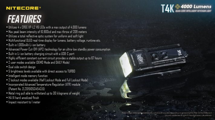 – Ενσωματώνει 4 LED CREE XP-L2 V6 με μέγιστη ισχύ που φθάνει τα 4000 Lumens