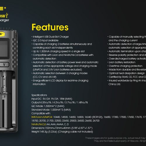 - Συμβατός με τις μπαταρίες IMR/Li-ion/LiFePO4: 10440, 14500, 14650, 16500, 16340(RCR123), 16650, 17350, 17500, 17650, 17670, 17700, 18350, 18490, 18500, 18650, 18700, 20700, 21700, 22500, 22650, 25500, 26500, 26650, 26700