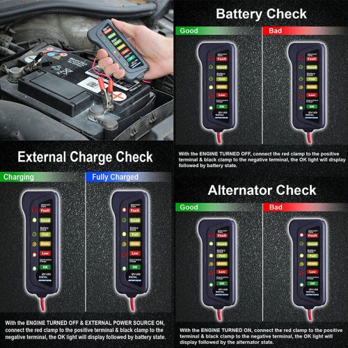 - Το διαγνωστικό tester μπαταρίας με τις 6 ενδείξεις LED σας βοηθά να ελέγχετε την υπολειπόμενη διάρκεια ζωής & την κατάσταση της μπαταρίας του αυτοκινήτου σας σε λίγα μόνο δευτερόλεπτα.